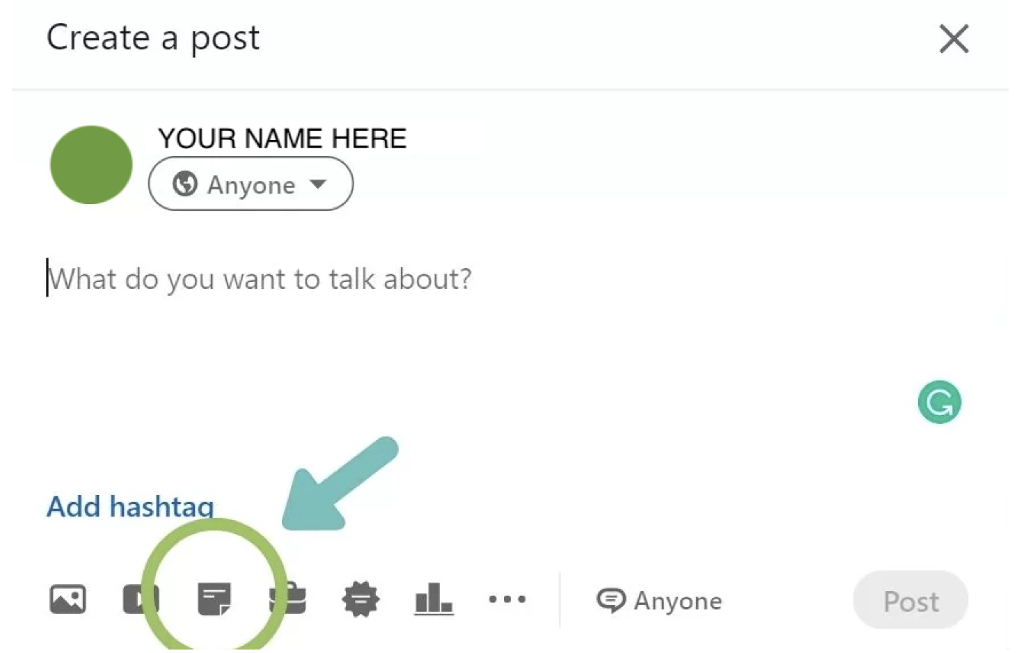 When you create a post on LinkedIn, you’ll want to choose the ‘Upload Document’ button.